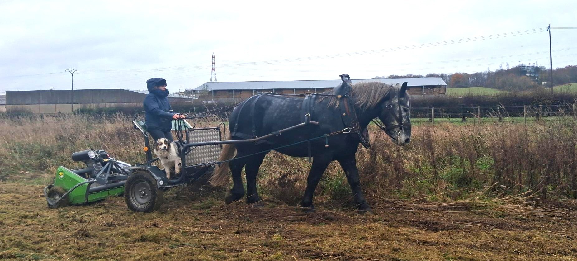 Lors de la fauche des prairies de l’ouvrage hydraulique du Pivot à Limours fin 2025, deux chevaux ont été attelés pour broyer les prairies avec un broyeur thermique.